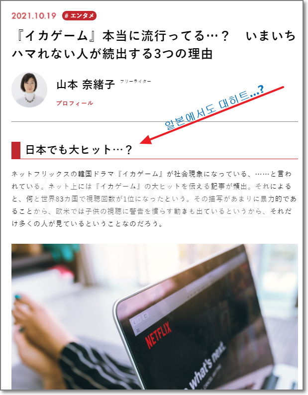 야마모토 나오코라는 자유 기고자가 "자기 주변에서는 오징어 게임의 인기를 느낄 수가 없는데 일본에서도 넷플릭스 1위를 차지하고 있다.. 이상하다"라고 주장하고 있습니다.