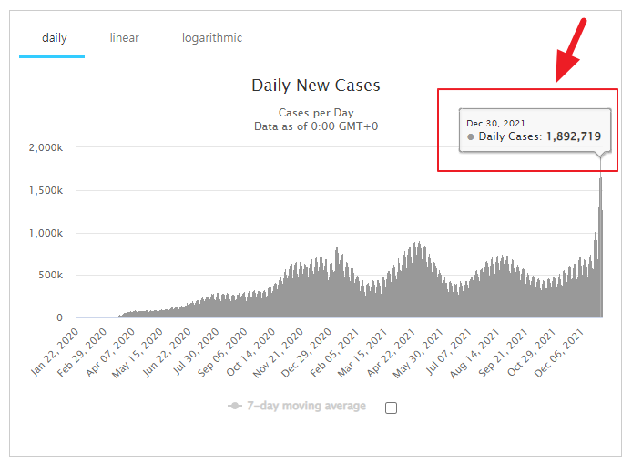 신종 코로나바이러스 감염증(코로나19) 오미크론 변이의 유행으로 세계 코로나19 확진자 수가 연일 최대치를 경신하고 있습니다. 2일(현지 시간) 뉴욕타임스(NYT)에 따르면 지난해 12월 31일 기준 미국의 일주일 평균 일일 코로나19 확진자 수는 37만8516명으로 역대 최대치를 보였는데요. NYT는 “미국인들이 연말 휴일을 즐기는 사이 바이러스는 쉬지 않고 퍼졌다”고 전했습니다. 지난해 마지막 날의 전 세계 하루 확진자 수도 189만여 명으로 코로나19 집계가 시작된 이후 사상 최다를 기록했습니다.