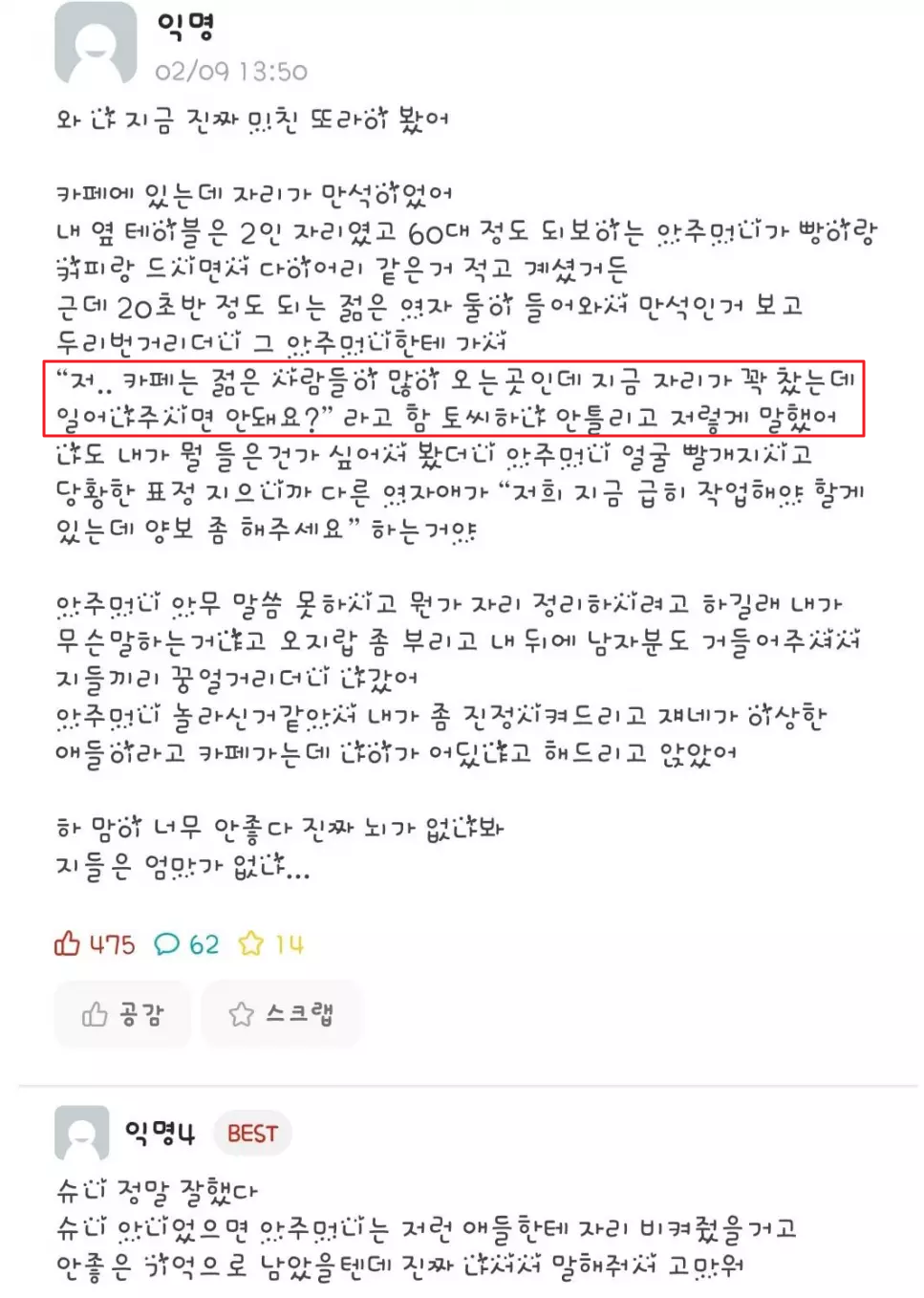 20대 초반 정도 되는 젊은 여자 둘이 "카페는 젊은 사람들이 많이 오는곳인데 지금 자리가 꽉 찼는데 일어나주시면 안돼요?", "저희 지금 급히 작업해야 할게 있는데 양보 좀 해주세요"......이게 말인가요???