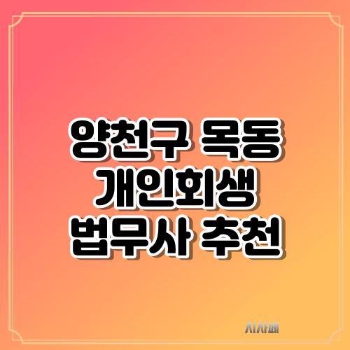 개인회생을 신청할 때는 소득이 있어야 하며, 일정한 기준 이상의 소득이 지속적으로 발생할 것이 예상되어야 합니다. 또한, 신청 전에 채무 상황을 정확히 파악하고, 필요한 서류를 꼼꼼하게 준비해야 합니다. 법적 절차에 익숙하지 않다면 전문가의 도움을 받 는 것이 좋습니다. 개인회생 절차는 복잡할 수 있으므로, 절차를 정확히 이해하고 올바르게 진행하기 위해서는 법률 전문가와 상담하는 것이 중요합니다. 법무사 또는 변호사를 통해 개인회생 신청 절차, 필요 서류, 가능한 채무 조정 방안 등에 대해 상세한 조언을 받으세요. 이상으로 양천구 목동 지역의 법무사 사무소 리스트와 함께 개인회생에 대한 간략한 개요와 주의사항을 소개드렸습니다. 법률적 문제나 고민이 있으시다면, 각 사무소에 상담을 요청하여 전문가의 도움을 받으시는 것을 추천드립니다. 추가 정보 및 상담을 원하신다면, 각 법무사 사무소의 공식 웹사이트 또는 연락처를 통해 문의하실 수 있습니다. - [동명법무사사무소](https://blog.naver.com) - [김성재법무사사무소](https://blog.naver.com) - [법무법인 강서](https://www.kangseolaw.com/) 각 사무소는 개인의 상황에 맞는 맞춤형 법률 서비스를 제공할 것입니다.