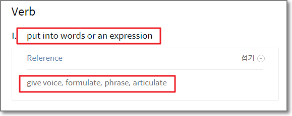 바로 밑에 보면 give voice(목소리를 내다), formulate(공식화하다), phrase(구), articulate(명료하게 하다)를 보면 더욱 word 동사의 뜻이 명확해집니다.