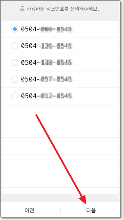 사용하실 팩스번호를 선택하라고 하는데요. 마음에 드는 번호를 선택하고 다음을 누릅니다.