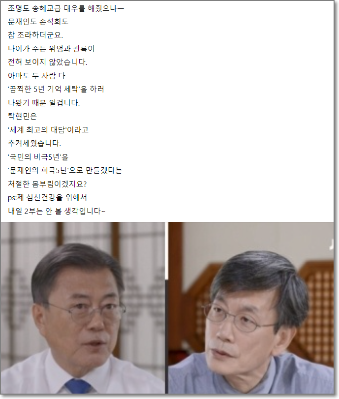 그러면서 "5년만에 '불임정권'으로 쫓겨난 처지에 뭘 이렇게 요란한 이별식을 하는지ㅡ 애처롭더군요. 제가 본 오늘의 하이라이트! '나는 링 위에 올라간 적이 없다.' 고로 대선에서 '정권재창출을 못한건 내 책임이 아니다'입니다. (지난 5년내내 관중석에서?) 카메라도 수십대 동원하고 조명도 송혜교급 대우를 해줬으나ㅡ 문재인도 손석희도 참 초라하더군요. 나이가 주는 위엄과 관록이 전혀 보이지 않았습니다. 아마도 두 사람 다 '끔찍한 5년 기억 세탁'을 하러 나왔기 때문 일겁니다. 탁현민은 '세계 최고의 대담'이라고 추켜세웠습니다. '국민의 비극5년'을 '문재인의 희극5년'으로 만들겠다는 처절한 몸부림이겠지요?