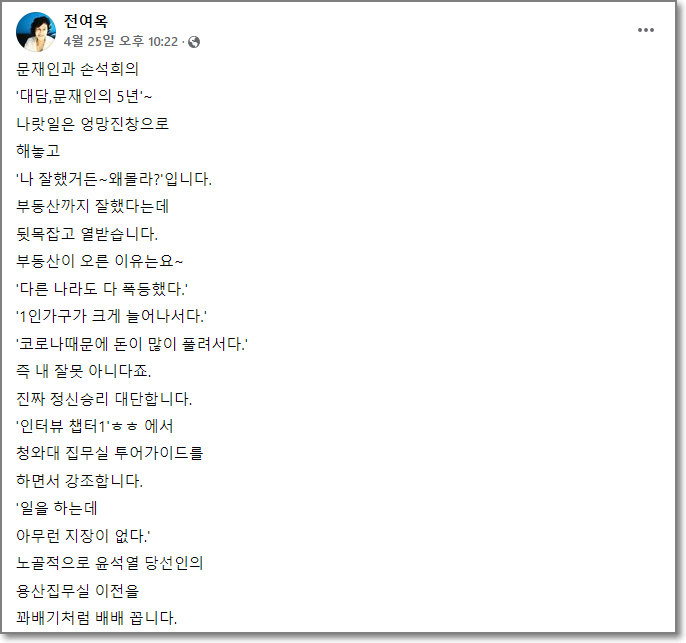전여옥 전 의원은 해당 글에서 "문재인과 손석희의 '대담,문재인의 5년'~ 나랏일은 엉망진창으로 해놓고 '나 잘했거든~왜몰라?'입니다. 부동산까지 잘했다는데 뒷목잡고 열받습니다. 부동산이 오른 이유는요~ '다른 나라도 다 폭등했다.' '1인가구가 크게 늘어나서다.' '코로나때문에 돈이 많이 풀려서다.' 즉 내 잘못 아니다죠. 진짜 정신승리 대단합니다. '인터뷰 챕터1'ㅎㅎ 에서 청와대 집무실 투어가이드를 하면서 강조합니다. '일을 하는데 아무런 지장이 없다.' 노골적으로 윤석열 당선인의 용산집무실 이전을 꽈배기처럼 배배 꼽니다. 그러는 문재인은 왜? '광화문 시대'를 열겠다고 난리쳤죠? 오늘 대담 보며 많은 생각이 들었어요. 5년 칭찬은 듣고싶은데 아무도 안해주니 '청와대 자체 제작'으로 '잘했군 잘했어~'를 만든겁니다. 참 가련합니다."라고 덧붙였습니다.