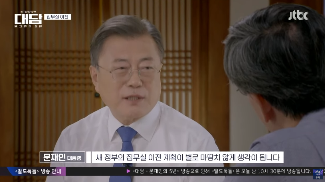 문 대통령은 JTBC 특별 대담에서 "집무실을 옮기는 것은 국가의 백년대계인데 어디가 적절한지 등을 두고 여론 수렴도 해보지 않았다. 게다가 안보 위기가 가장 고조되는 정권 교체기에 '3월 말까지 국방부 나가라, 방 빼라. 우리는 거기에서 5월 10일부터 업무 시작하겠다'라는 식의 일 추진이 저는 정말 마땅치 않고, 위험하다고 생각한다"라고 말했습니다.