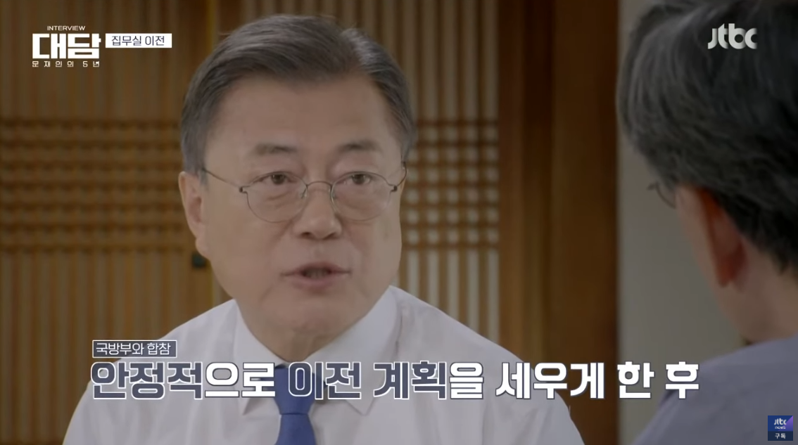 이어서 손석희 앵커가 “집무실 이전은 문 대통령 공약이기도 했다”고 반문하자 문 대통령은 “개념이 다르다. 대통령 집무실과 비서실을 광화문 정부종합청사로 옮기고 행안부가 세종시로 이전하게 되면 본관이나 영빈관, 헬기장이나 지하 벙커 위기센터 등은 시민에 개방한 이후에도 청와대가 사용한다는 개념이었다"고 답변했습니다.