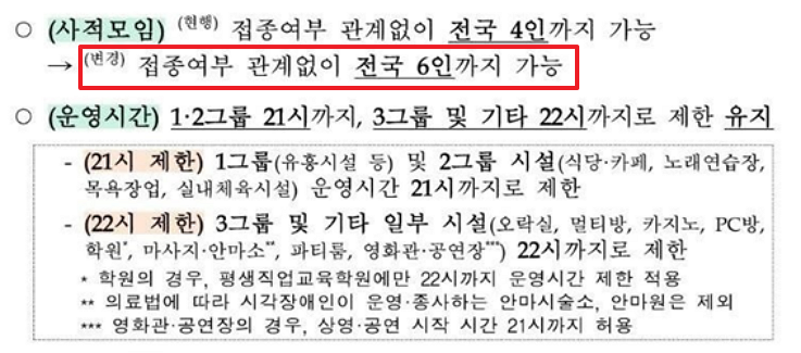 사적모임이 현행 전국 4인에서 전국 6인까지 가능합니다.(접종 여부 상관없습니다.)