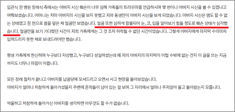 사망할 당시 너무나도 시신훼손이 심해서 가족들에게 시신을 볼 것이냐고 몇번을 재차 확인했다고 합니다.