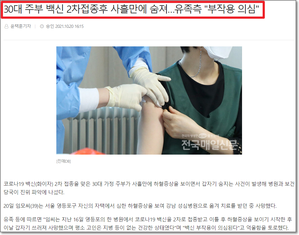 이 여성의 남편은 자신의 부인이 코로나19 백신(화이자) 2차 접종을 받은 후 하혈과 호흡곤란 등을 호소하다 숨졌다고 주장했습니다. 특히 자신의 부인이 소방당국의 늑장 출동으로 인해 제때 치료를 받지 못해 숨졌다며 당국의 책임을 촉구하고 나섰습니다.