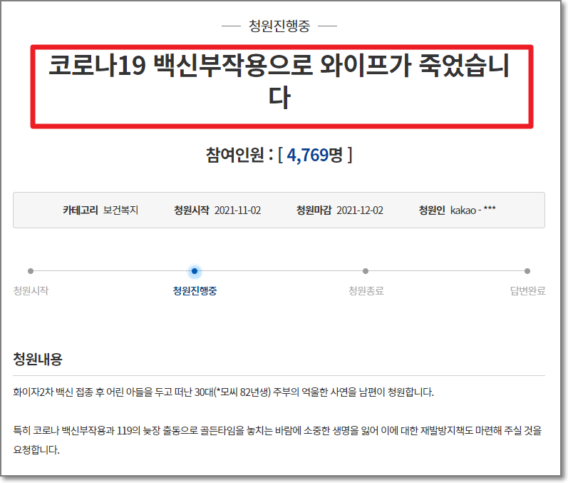 A씨는 “정부는 백신을 맞으라고 권유만 할 것이 아니라, 백신 부작용에 대한 조사를 철저히 해서 원인을 밝혀 국민이 억울함이 없도록 해달라”고 요청했습니다.