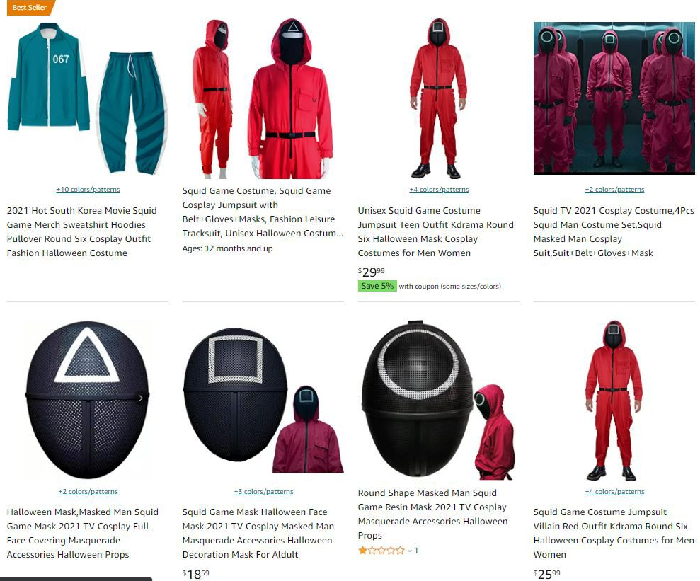 오징어게임 내 마스크와 복장이 선풍적인 인기를 끌고 있습니다.