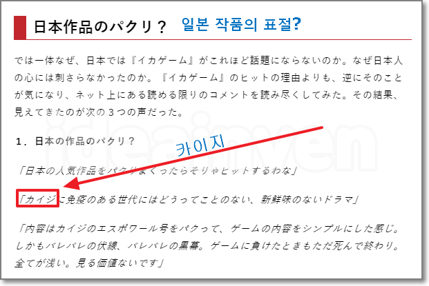 일본인은 공감하기 어렵라는 내용도 나오는데요. 돈이 없어서 죽음의 게임에 참여한다는 것이 일본에서는 이미 10년전에 있던 일이고 오징어 게임에서 묘사하는 인간 군상이 다소 단순하다고 지적을 하면서 일본은 삶의 괴로움에 대한 이유가 훨씬 다양하기 때문에 그러한 데스 게임에 참여하는 이유가 좀 더 확대되었으면 하는 게 필요했다고 말합니다.