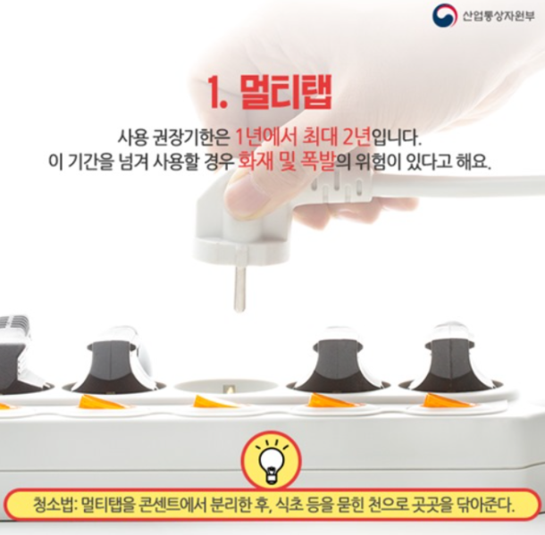 산업통상자원부에서 나온 카드뉴스에도 멀티탭의 사용 권장기한은 1년에서 최대 2년이며 이 기간을 넘겨 사용할 경우 화재 및 폭발의 위험이 있다고 합니다.