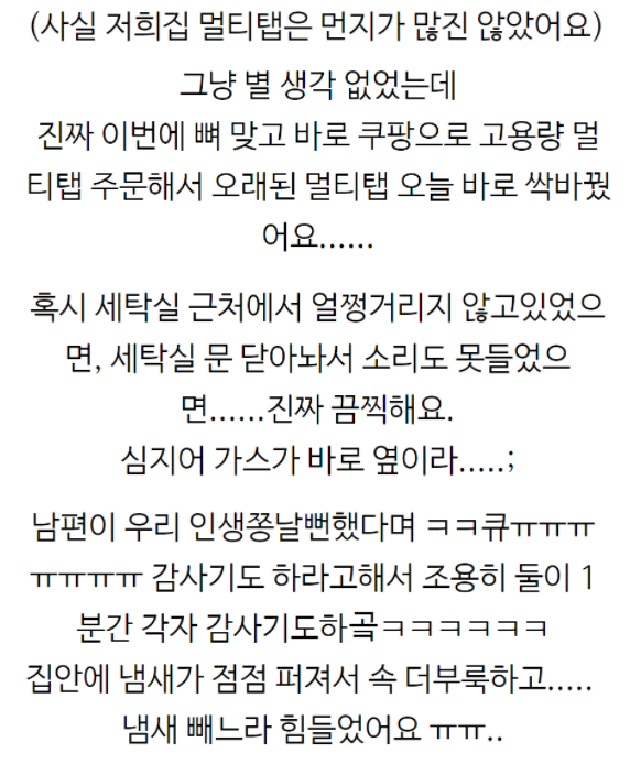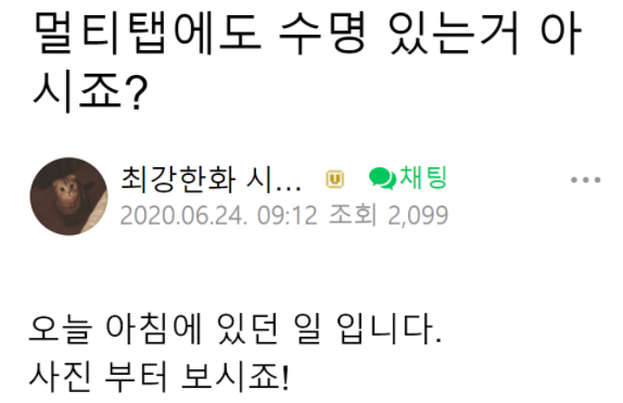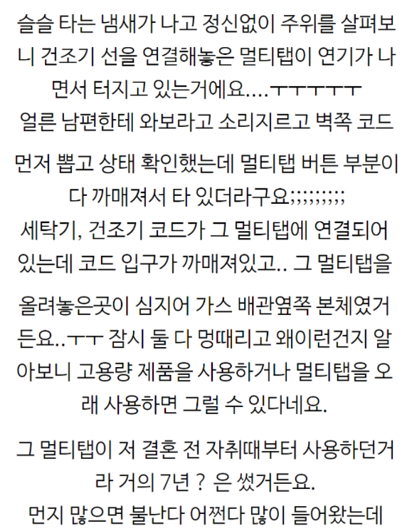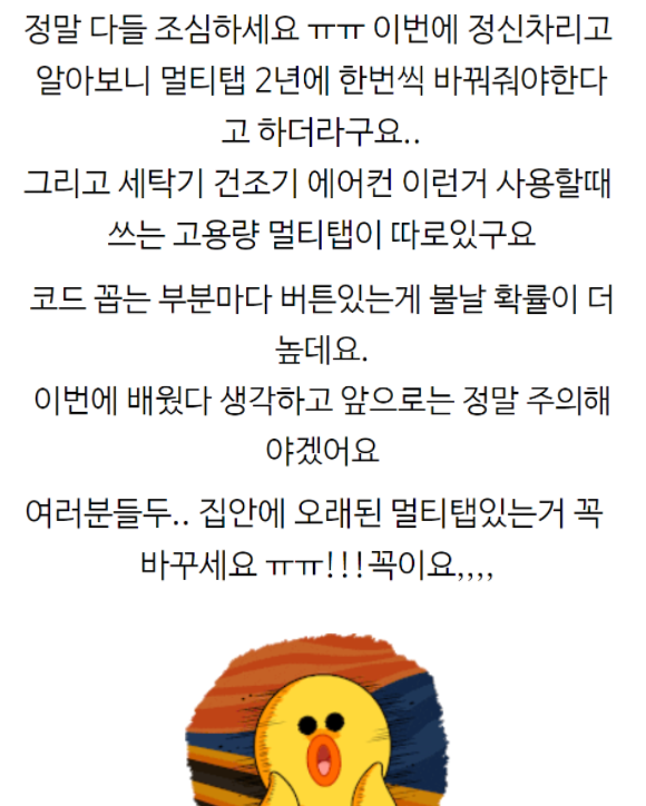 삐약이의 "절규"까지 등장하는군요. 세탁하고 건조기 돌리는 중에 세탁실에서 "펑펑펑" 하면서 냄새가 나길래 원인을 찾아보니 멀티탭이 연기가 나면서 터지고 있었다고 합니다. 급히 전원을 뽑고서 보니까 멀티탭 연결구가 까맣게 탔다는 내용인데요. 바로 쿠팡으로 고용량 멀티탭 주문했다고 하네요(설마 쿠팡 바이럴은 아니겠죠?). 2년에 한번씩 바꿔줘야 한다는 내용이 나오기도 합니다.