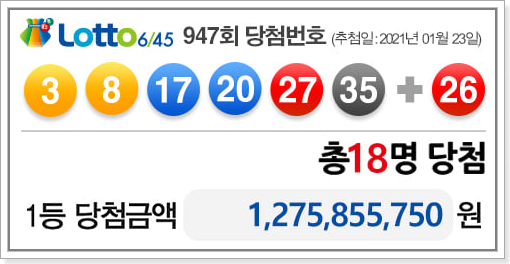 제 947회 동행복권 로또 1등 당첨번호 공나온순서는 27, 17, 35, 20, 3, 8 에 보너스번호는 26 입니다.