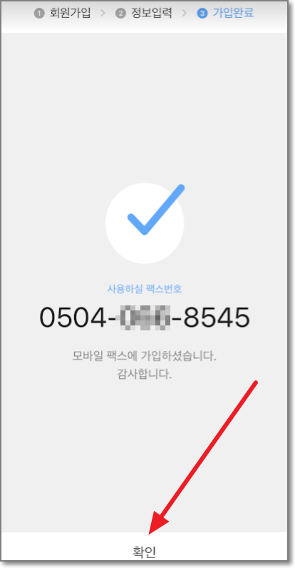 이제 다 끝났습니다. 보이는 번호가 부여받으신 팩스번호입니다. "확인"을 누릅니다.