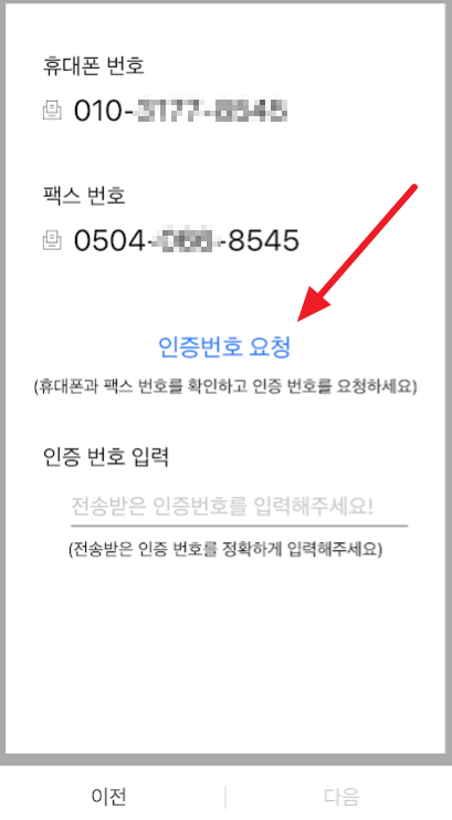 휴대폰번호를 확인하고 "인증번호 요청"을 누릅니다.