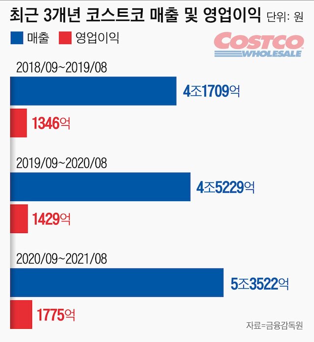코스트코코리아는 2020년 9월 1일부터 2021년 8월 31일까지 연매출 5조3522억원으로 한국에서 사상 첫 매출 5조원을 돌파했는데요. 영업이익은 1775억원, 당기순이익은 1347억원을 기록하며 코로나19 상황에서도 호실적을 이어갔습니다.