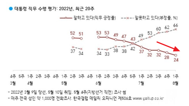 한국갤럽이 8월5일 발표한 8월 첫째 주(2~4일) 전국 만 18세 이상 1001명에게 윤석열 대통령이 직무수행을 잘하고 있다고 보는지 물은 결과, 24%가 긍정평가한 반면 66%가 부정평가했으며 그 외는 의견을 유보했습니다.(어느 쪽도 아님 2%, 모름/응답거절 8%) 제 18대 대통령인 박근혜 전 대통령은 국정 개입 의혹이 증폭되던 2016년 10월 셋째 주(긍정 25%, 부정 64%)였으며, 제 19대 문재인 전 대통령은 임기 중 최저치가 29%(21년4월 다섯째 주)였습니다.