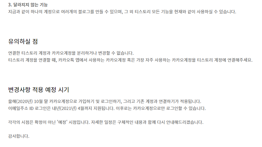 티스토리는 현재는 이메일만 있으면 가입할 수 있지만, 추후 2020년 10월 말부터는 카카오계정으로 가입하기, 로그인하기 그리고 기존계정과 연결하기가 적용되며, 2021년 4월 이후부터는 "카카오계정으로만 로그인을 할 수 있습니다."