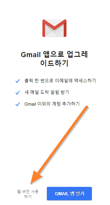 아래처럼 Gmail앱으로 업그레이드하기 가 나오는데요. 그냥 화살표친 "웹버전사용하기"를 누르시면 됩니다.